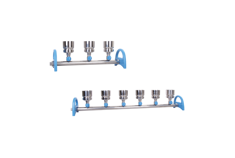 Manifold de seis posições em aço inoxidável com adaptador de funil Rocker SF, MultiVac 301 – MB, Funil SF de 100 mL x 6