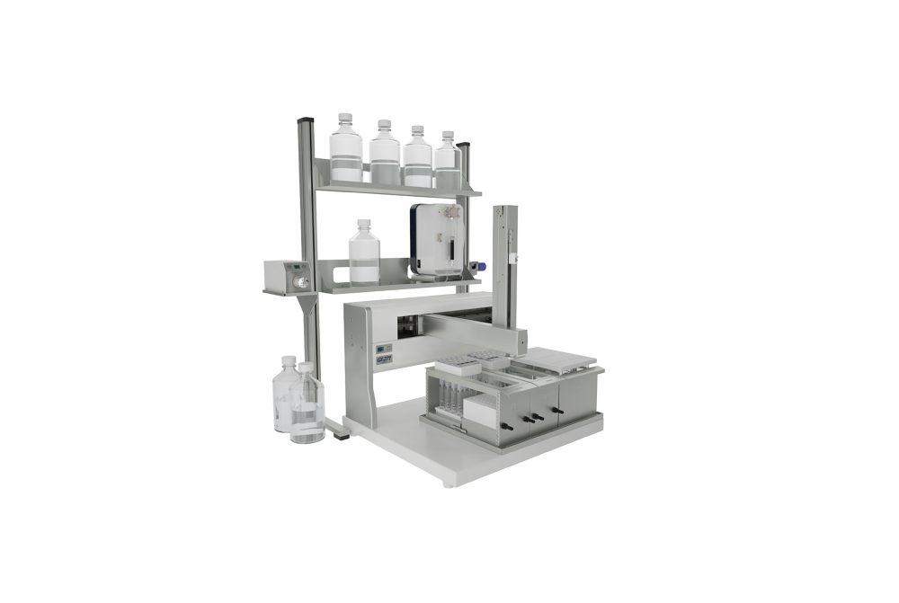 Capaz de processar amostras de pequeno volume, até 144 sem supervisão, e amostras de grande volume (até 2 litros) via válvulas seletoras Valvemate. Os racks móveis acomodam cartuchos SPE de polipropileno e vidro de 1, 3 e 6 mL e permitem múltiplas eluições de frações por amostra. A bomba de seringa gerencia volumes de 1 mL a 10 mL com alta precisão, permitindo a transferência das frações eluídas para frascos de injeção selados ou diretamente para o sistema LC com o módulo opcional de injeção direta GX.